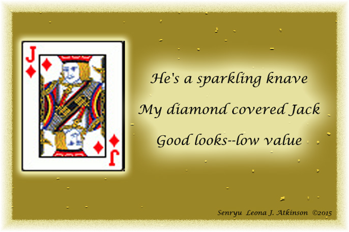 Posted in April 2015, NaPoWriMo 2015, Senryu Jack of Diamonds Posted on April 23, 2015 by Leonas Lines Original Poetry by Leona J. Atkinson ©2015(clipart from wikipedia.org) NaPoWriMo–Day 23–Pick a card from a deck of cards and write a poem about it Share this: Click to share on X (Opens in new window) X Click to share on Facebook (Opens in new window) Facebook Click to email a link to a friend (Opens in new window) Email Click to print (Opens in new window) Print Click to share on Reddit (Opens in new window) Reddit Click to share on LinkedIn (Opens in new window) LinkedIn Click to share on Pinterest (Opens in new window) Pinterest Click to share on Pocket (Opens in new window) Pocket Click to share on Tumblr (Opens in new window) Tumblr Like Loading... Related Author: Leonas Lines A born and raised Midwesterner who traveled to Oregon in 2006 via the Oregon Trail route, fell in love with Oregon and now call it home. I am retired and pursuing my life long dream of becoming a Freelance Inspirational Writer. View All Posts