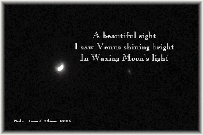 Sorry the picture is not very good. Sigh….I wish I had a really good camera to capture some of the amazing sights I see! I was so excited to see this moon and bright star last night (which I later found out was Venus) but quite disappointed that I could not take a good picture of it. For more information and better picture visit EarthSky.org