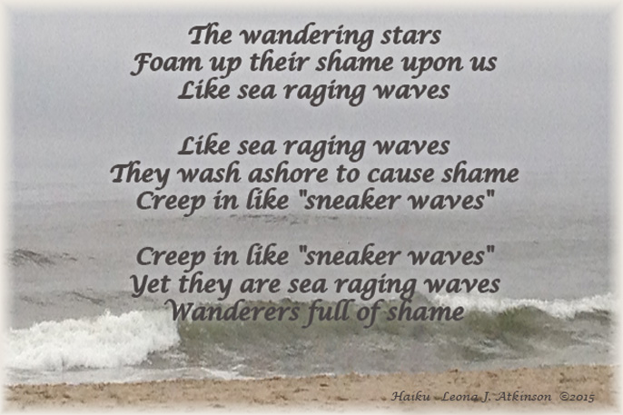 Posted in Haiga, Haiku, Haiku Horizons Weekly Prompt, May 2015, Scripture Shameful Stars Posted on May 19, 2015 by Leonas Lines Original Poetry and Photograph by Leona J. Atkinson ©2015 Based on Jude 1:13—>Read the different versions of this verse at Bible Hub Haiku Horizons Weekly Challenge–Week #65–Prompt: “shame“