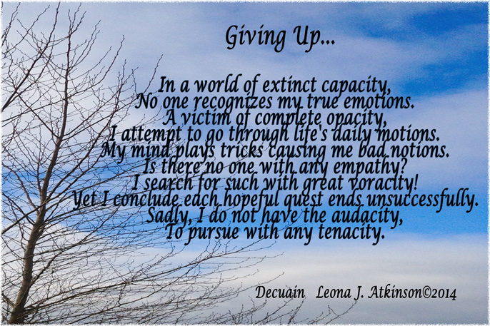 I wrote this poem, sadly, because of a conversation with a person who is dear to me that was experiencing feelings of giving up because of recent circumstances in his life. As we talked, he asked me what empathy meant. I explained it’s meaning. His tears moved me to realize that is what he was looking for, and not finding it, he was too weak to continue his search. The poem is written to express his feelings. However, I have hope that my actions and prayers will be the helping hand he needs at this time.